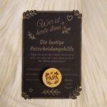 Geben Sie Ihren Wunschtext einfach im Bestellfeld ein. Fügen Sie bei Bedarf Symbole oder ein Logo hinzu. Anschließend setze ich das Layout sorgfältig. Auf Wunsch stimme ich Details vorab mit Ihnen ab. Dadurch erhalten Sie genau die Gravur, die Sie möchten.